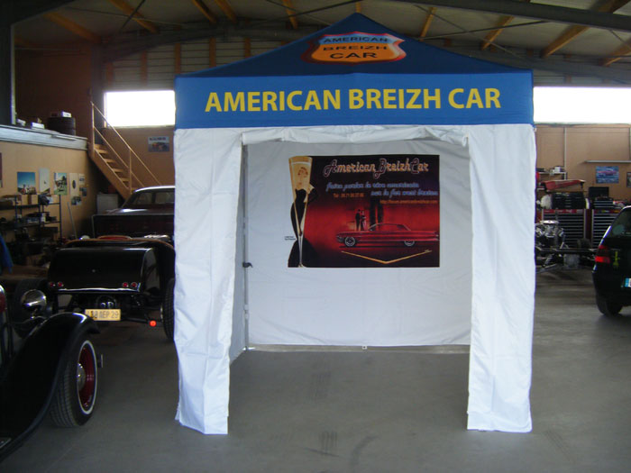 Barnum blanc 2,40 x 2,40 à l’image du club pour exposition principalement en intérieur, traité anti-feu.