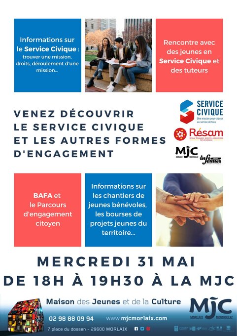 Le RESAM et le SIJ de la Mjc Morlaix vous propose une soirée "service civique et autres formes d’engagement" à la MJC le MERCREDI 31 MAI.