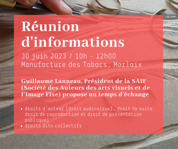Guillaume Lanneau, Président de la SAIF (Société des Auteurs des arts visuels et de l’Image Fixe) propose une réunion d’informations et un temps d’échange sur la SAIF aux Moyens du Bord le vendredi 30 juin.