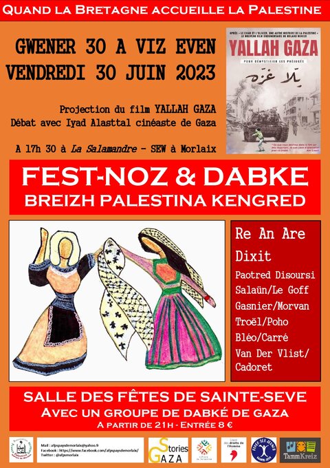 Journée en deux parties : 17h 30 ciné-débat à La Salamandre autour du film YALLAH GAZA en présence de Iyad Allastal, cinéaste de Gaza. Puis à partir de 21 h Fest-noz la salle des fêtes de Sainte-Sève avec des danseurs palestiniens de Dabké présents dans le film.