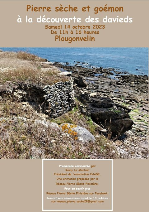 En Finistère, la pierre sèche est souvent liée à la récolte du goémon notamment par l’utilisation des nombreux fours mais aussi des davieds *(ou daviers) que l’on peut encore découvrir dans la région de Plougonvelin. Le Réseau Pierre Sèche Finistère vous propose une promenade guidée qui vous permettra de découvrir les derniers davieds avant que ceux-ci ne soient définitivement effacés par l’érosion et le recul du trait de côte... Savoir-faire propre à notre territoire, ingéniosité, et surtout extraordinaire technicité, notre guide Rémy L E MARTRET, Président de l’association PHASE, vous expliquera tout ce qui concerne les davieds et leur histoire. Il a effectué des recherches approfondies sur le sujet, et se bat pour qu’au moins un de ces davieds soit préservé pour perpétuer le témoignage du précieux savoir-faire des muraillers qui ont réalisé à flancs de falaises ces incroyables ouvrages.
