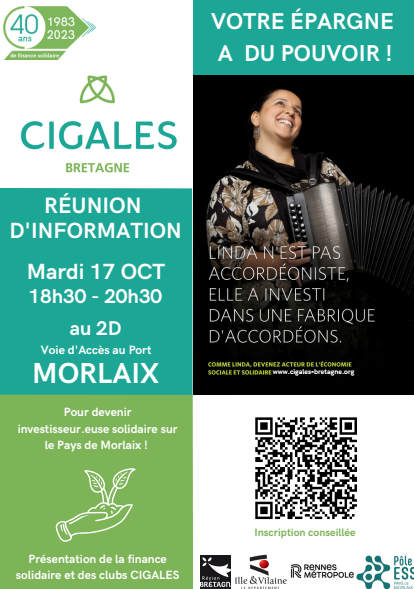 Le Pôle ESS du Pays de Morlaix et les Cigales de Bretagne ont le plaisir de vous convier à une soirée sur L’épargne Citoyenne comme levier de la Transition Écologique Mardi 17 Octobre à 18h30 au 2D Voix d’accès au Port à Morlaix.