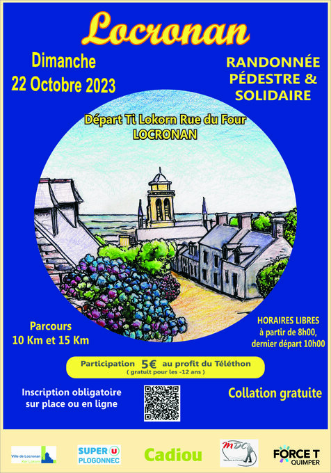 L’association Force T Quimper et les Marcheurs de Cornouaille organisent une randonnée pédestre et solidaire au profit du Téléthon sur Locronan le Dimanche 22 Octobre deux circuits 10 et 15 km . Départ libre de l’Espace Ti Lokorn à partir de 8 h, dernier départ 10 h, inscription sur place, collation et ravitaillement gratuit Parcours associant une vue sur le coeur historique de Locronan en direction du bois de Nevet ....retour par les chemins creux et passage à la Chapelle de la Bonne nouvelle ..