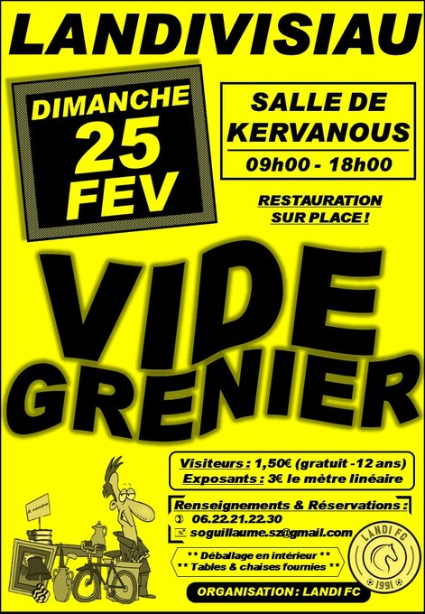 Vide-grenier organisé par le Landi FC ; salle de Kervanous (près du Centre E.Leclerc) à Landivisiau ; accueil des Exposants à partir de 07h00 ; ouverture au public de 09h00 à 18h00 ; exposants = 3€ le mètre linéaire, visiteurs = 1,50€ (gratuit pour les moins de 12 ans) ; 2 salles couvertes (tables et chaises fournies) ; 300m de déballage en intérieur + déballage extérieur ; restauration sur place (boissons, barbecue, sandwichs, frites, bonbons, crêpes, etc.)