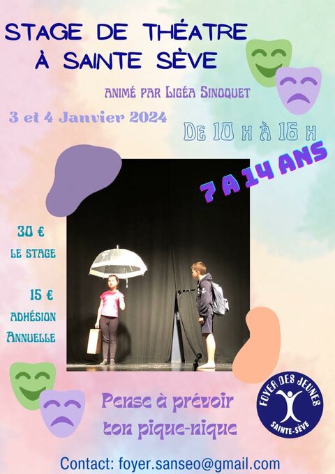 Stage de théâtre organisé par le Foyer des jeunes de Ste Sève animé par Ligéia Sinoquet pour les enfants de 7 à 14 ans les 3 et 4 janvier 2024 de 10 h à 16 H (prévoir le pique nique pour le midi)