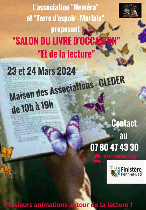les associations "Héméra" et Terre d’Espoir Morlaix" organisent le Salon du livre d’occasion et de la lecture pour sa deuxième édition. Vente de livres à très bas prix (à partir de 0.50€) et et de nombreuses animations autour de la lecture :