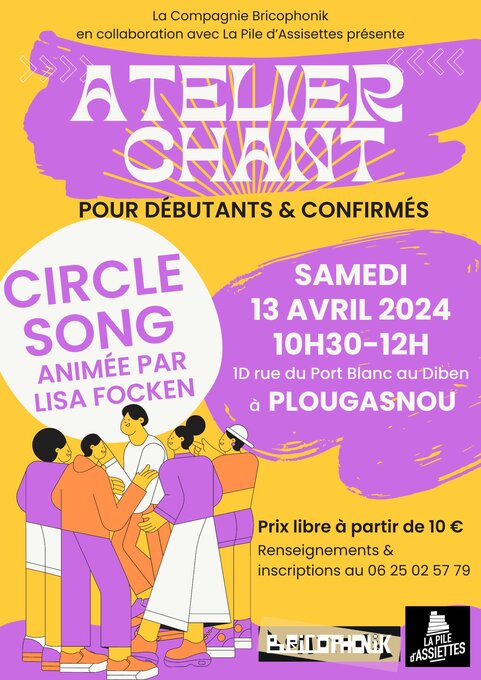 Cet atelier est un moment d’écoute et de partage pour chanter et créer ensemble dans la bonne humeur. Le "Circle Song" est une technique basée sur l’improvisation et le lâcher prise vous fera découvrir des univers insoupçonnés.