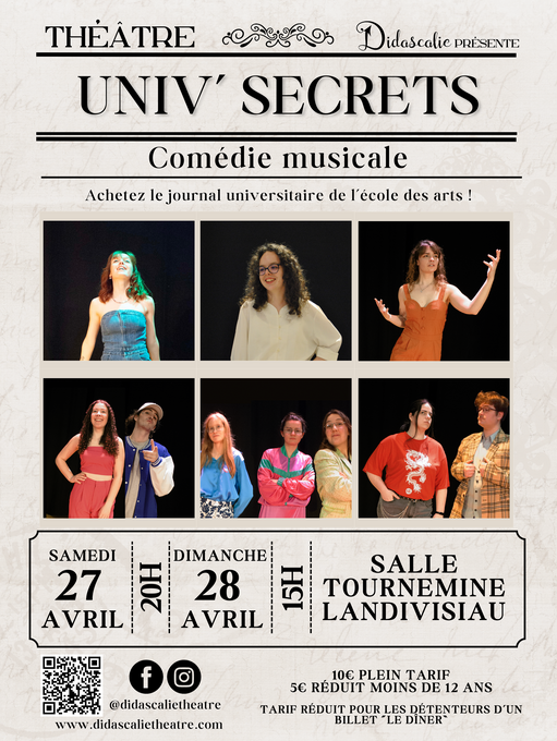 Dans cette école d’art, étudiants et professeurs se mettent en quête de réaliser leurs plus grands rêves. Tout se complique quand un affreux journal pirate est publié. Un quotidien perturber entre les histoires d’amour, d’amitié, de secret et d’interdit. Sur des chansons du répertoire français interprétées en playback, cette pièce de théâtre nous offre un moment plein de joies et de drames. Ambiance garantie !