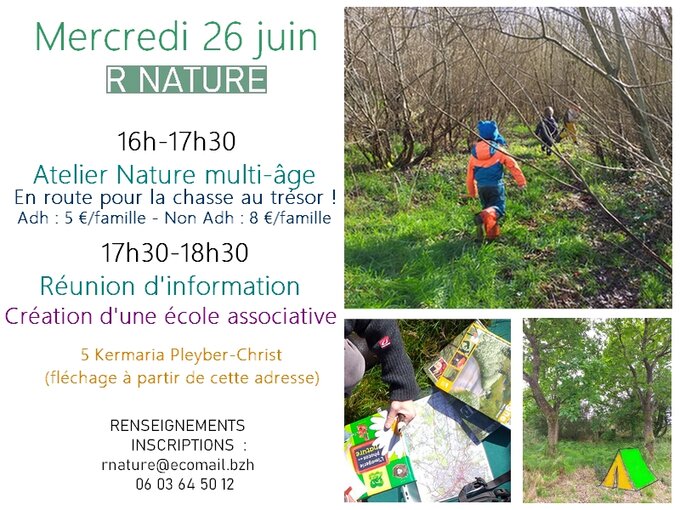 Nous proposons un atelier nature mercredi 26 juin de 16h à 17h30 sur le bois de Pleyber-Christ. La thématique est l’orientation et la chasse au trésor. L’atelier est multi-âge et permet de s’adapter à tous. Hélène Recule, intervenante en atelier nature proposera différents matériels et techniques pour partir à l’aventure de la chasse au trésor.