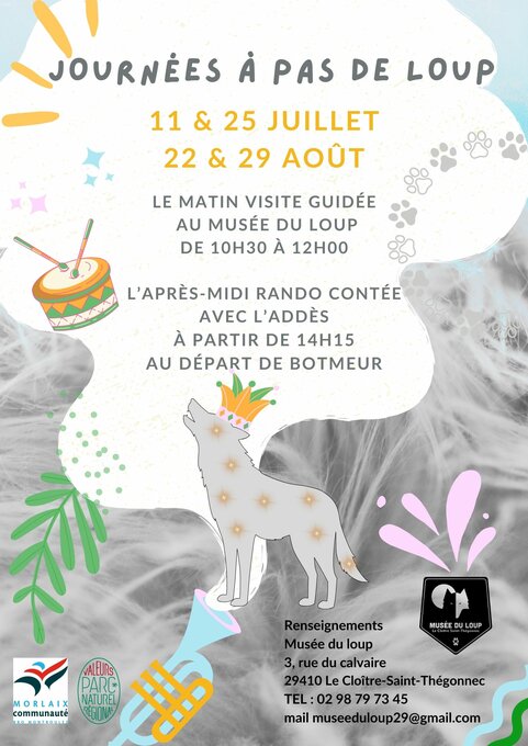 Journée à pas de loup en partenariat avec l’Addès. Visite guidée au musée le matin de 10h30 à 12h00. Rando-contée l’après-midi avec l’Addès à partir de 14h15 au départ de Botmeur ( à partir de 7 ans) sur réservation auprès des deux structures. Musée du loup 02 98 79 73 45 / Addès 02 98 99 66 58