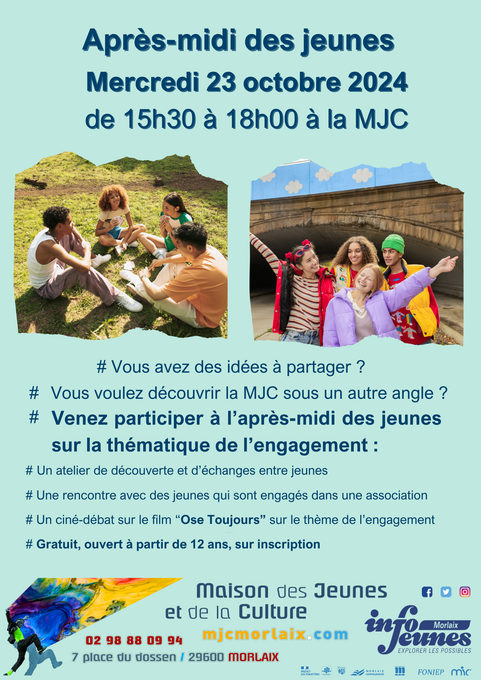Un après-midi pour les jeunes à partir de 12 ans sur la thématique de l’engagement est proposé à la MJC de Morlaix. Un atelier de découverte, une rencontre avec des jeunes engagés et un ciné-débat sur le film "Ose-Toujours" le mercredi 23 octobre de 15h30 à 18h00.