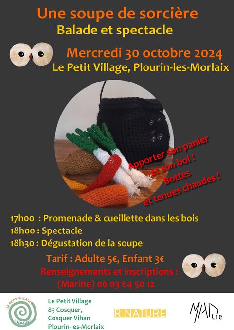 Au programme balade dans les bois et cueillette d’ingrédients, spectacle de conte de sorcière et de théâtre d’objet proposé par Mad Cie et pour finir, dégustation d’une bonne soupe.....de sorcière pour se réchauffer !