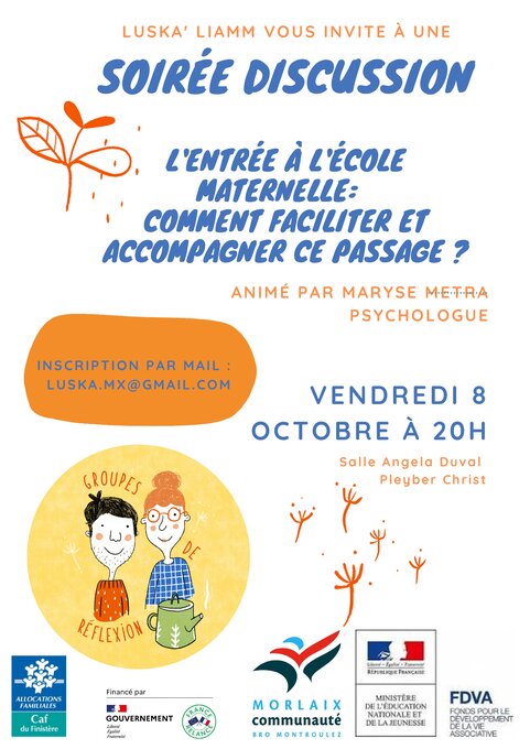 Soirée discussion vendredi 8 octobre dès 20h à la salle Angela Duval à Pleyber Christ avec Maryse Metra, ancienne institutrice, psychologue et formatrice à l’AGSA : L’entrée à l’école maternelle, comment faciliter et accompagner ce passage ?