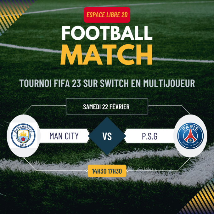 En date du samedi 22 février 2025 de 14 h 30 à 17 h 30, nous vous proposons au « 2D Espace Libre » un tournoi de jeux vidéo (FIFA 23) sur notre Nintendo Switch avec pour match d’ouverture « P.S.G. – Man City »