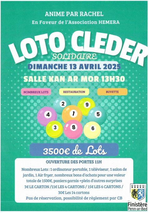 Venez nous rejoindre pour notre Grand Loto qui se tiendra le dimanche 13 avril 25 à Cléder Salle Kan Ar Mor, place Charles de Gaule de 13h30 à 18h30. Nous vous accueillons à partir de 11h avec une petite restauration !