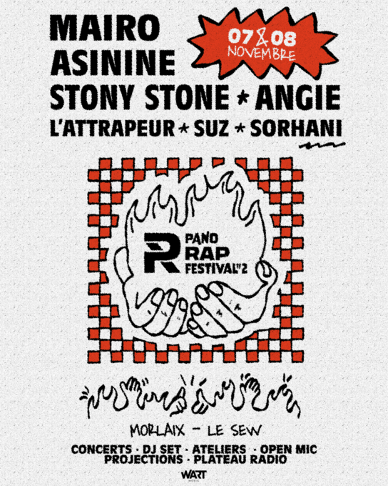 Le lineup ? MAIRO, dont le dernier album a fait l’effet d’une bombe dans les médias rap, ANGIE, diamant brut ascendant de la scène bretonne, STONY STONE, talent flamboyant méditerranéen aux featurings époustouflants, ASININE, dont la plume aiguisée nous transperce à chaque set. Le festival sera aussi très fier de présenter trois jeunes talents locaux, repérés dans le cadre du dispositif régional la TREND : SUZ, SORHANI et L’ATTRAPEUR. Le festival sera animé par l’inimitable MC Da Titcha.