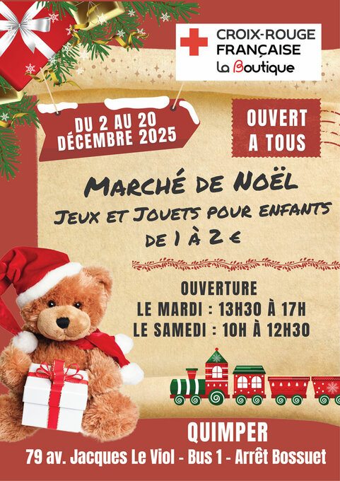 L’Unité Locale de la Croix-Rouge française de Quimper organise une opération solidaire « MARCHÉ DE NOËL – Jeux et jouets pour enfants » du 02 au 20 décembre 2025, tous les mardis de 13h30 à 17h00 et tous les samedis de 10h00 à 12h30, au 79, avenue Jacques-Le-Viol dans le quartier de Prat-Ar-Rouz (avec arrêt bus “Bossuet” à 150m).