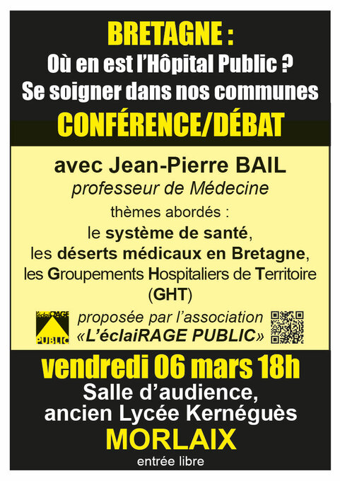 Il nous parlera des soins primaires, des soins de recours et des groupements hospitaliers de territoires (GHT). Il s’attardera en particulier sur la situation dans le Pays de Morlaix.