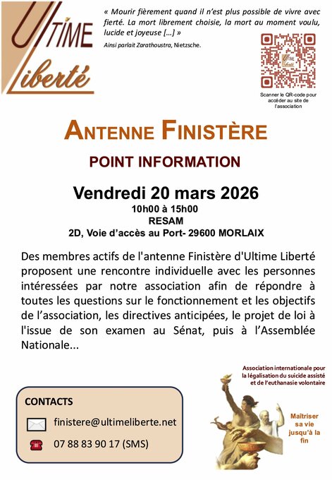 Des membres actifs de l’antenne Finistère d’Ultime Liberté proposent une rencontre individuelle avec les personnes intéressées par notre association afin de répondre à toutes les questions sur le fonctionnement et les objectifs de l’association, les directives anticipées, le projet de loi à l’issue de son examen au Sénat, puis à l’Assemblée Nationale...