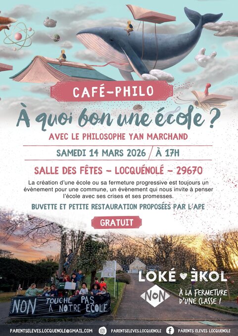 L’école publique Robert Toullec de Locquénolé est menacée par la suppression d’un poste. Alors nous, parents d’élèves, on se mobilise, et on vous invite à un café Philo pour réfléchir ensemble sur le thème « à quoi bon une école ? », réflexion animée par Yan MARCHAND, philosophe talentueux. On y sera, et vous ?