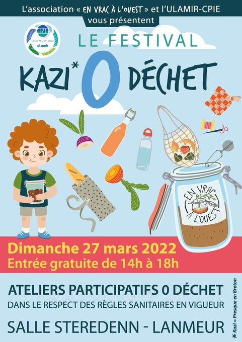 Une nouvelle édition du festival Kazi Zéro Déchet, en partenariat avec l’ULAMIR-CPIE se tiendra le dimanche 27 mars 2022 à la salle Steredenn, à Lanmeur.