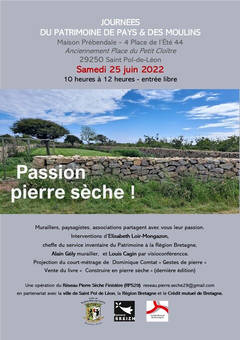 Interventions d’Elisabeth Loir Mongazon, cheffe du service inventaire du patrimoine de la Région Bretagne, Alain GELY, murailler pierre sèche et Louis Cagin par visio conférence. Vente de la dernière édition de son ouvrage « Construire en pierre sèche ».