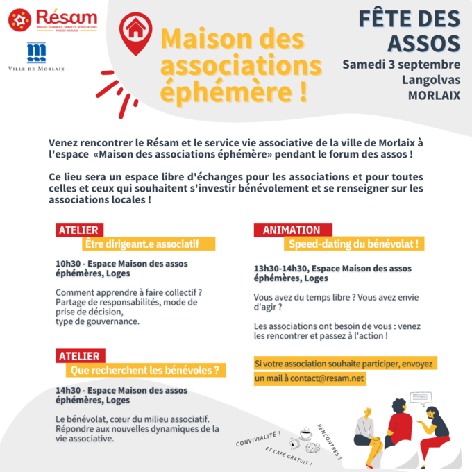 Venez rencontrer le Résam et le service vie associative de la Ville de Morlaix le temps d’une journée pour vous informer sur les différents aspects de la vie associative à travers des ateliers et animations, à l’espace « Maison des assos éphémère ».