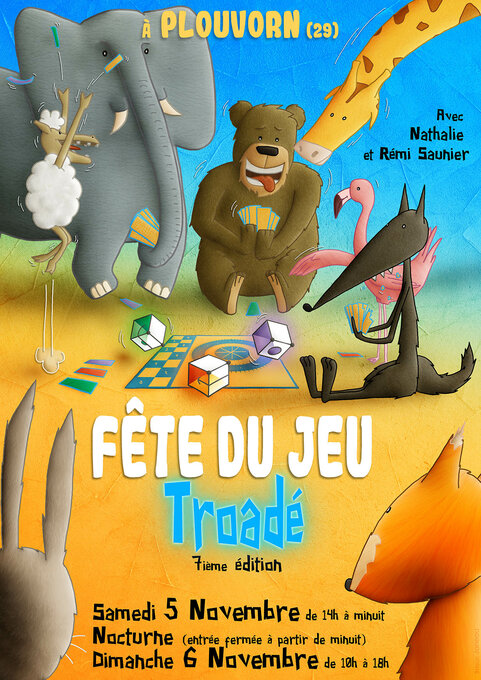 Pour sa 7ième édition, la fête du jeu "Troadé" change de date et de salle ! L’événement reste bien sûr gratuit et tout public, et il se déroulera les 5 et 6 novembre 2022 dans le cadre magnifique de l’espace culturel du plan d’eau de Plouvorn (29). De nombreux bénévoles, auteurs, ou professionnels seront présents pour vous accompagner lors de vos parties, dans une ambiance conviviale. Sont toujours d’actualité : le "Trophée des auteurs de jeux", les animations, la tombola, les food trucks, les crêpes, et la nocturne (entrée interdite après minuit). Par ailleurs, Nathalie et Rémi Saunier seront nos invités de marque, et vous pourrez en profiter pour faire dédicacer vos jeux !