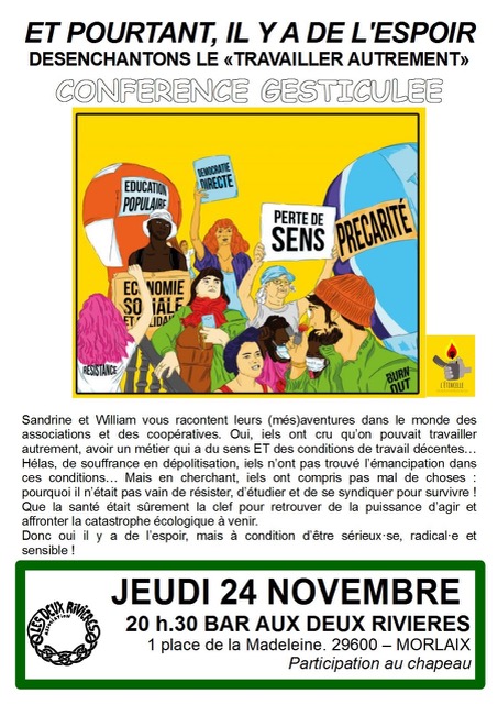 Sandrine et William vous racontent leurs (més)aventures dans le monde des associations et des coopératives. Oui, iels ont cru qu’on pouvait travailler autrement, avoir un métier qui a du sens ET des conditions de travail décentes… Hélas, de souffrance en dépolitisation, iels n’ont pas trouvé l’émancipation dans ces conditions… Mais en cherchant, iels ont compris pas mal de choses : pourquoi il n’était pas vain de résister, d’étudier et de se syndiquer pour survivre ! Que la santé était sûrement la clef pour retrouver de la puissance d’agir et affronter la catastrophe écologique à venir.