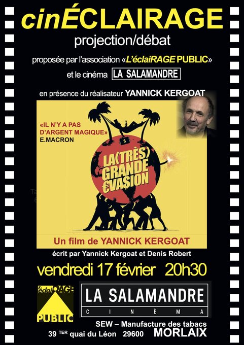 L’association « L’Éclairage Public » organise la projection du film documentaire « La très grande Évasion » écrit par Denis Robert et Yannick Kergoat. La projection sera suivie d’un débat en présence du réalisateur Yannick Kergoat.