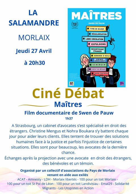 Un collectif d’associations du Pays de Morlaix venant en aide aux exilés organise un ciné débat le Jeudi 27 avril à 20h30 au Cinéma La Salamandre à Morlaix.