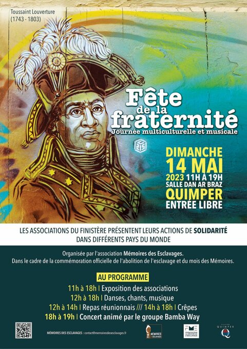 L’association « Mémoires des esclavages » organise sa 2ème fête de la Fraternité , le dimanche 14 mai 2023 de 11 h à 19 h à l’espace Dan Ar Braz , 17 ter rue de Stang Bihan à Quimper (face au parc des expositions). Lors de cette manifestation, 24 associations du Finistère, présenteront leurs actions de solidarité dans différents pays du monde, Haïti, La Réunion, Kenya, Palestine, Sénégal, l’Ukraine, Burkina Fasso, Cameroun, etc…